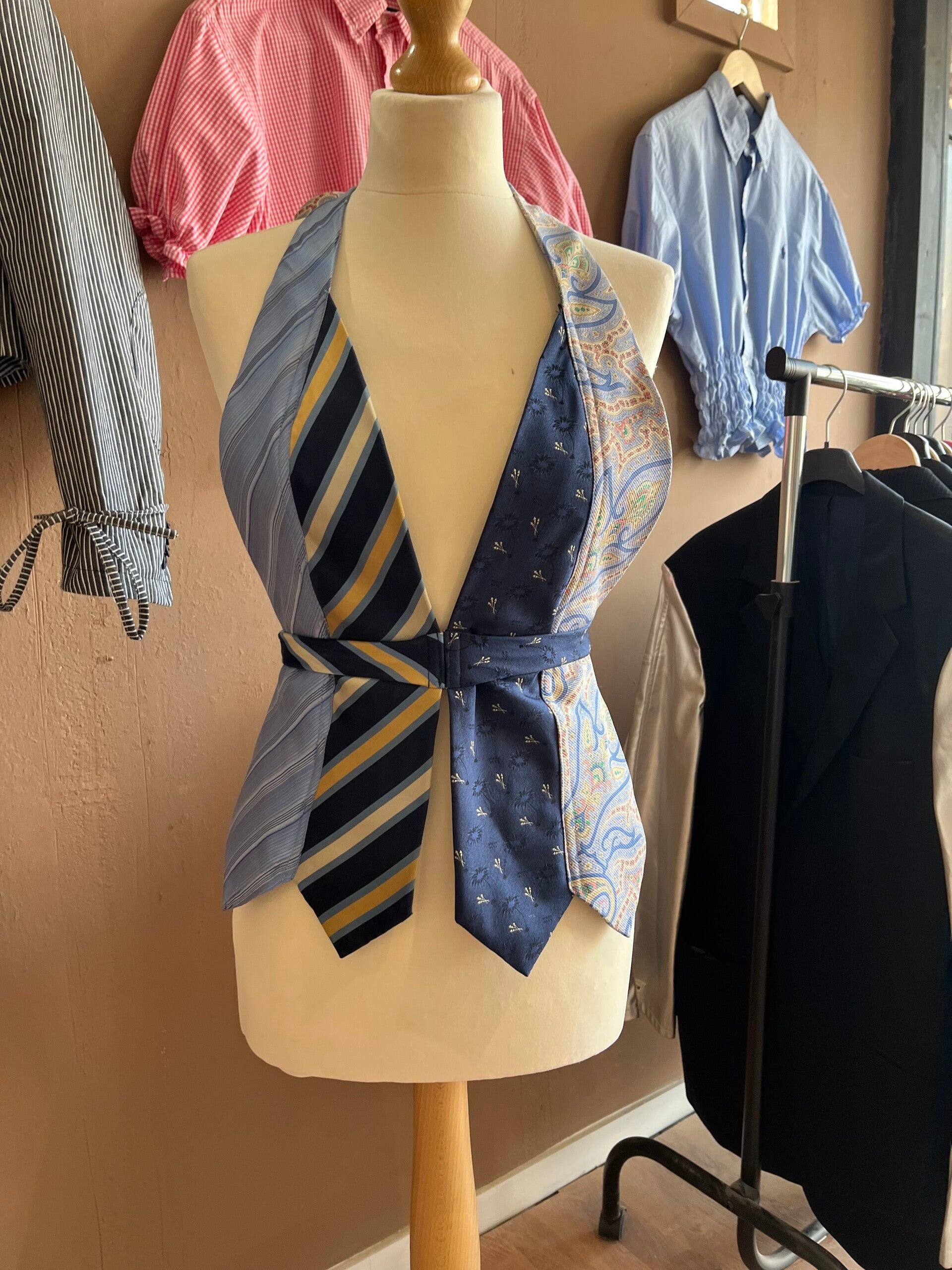 Verschillende kleuren stropdas topjes, gemaakt van tweedehands materialen.